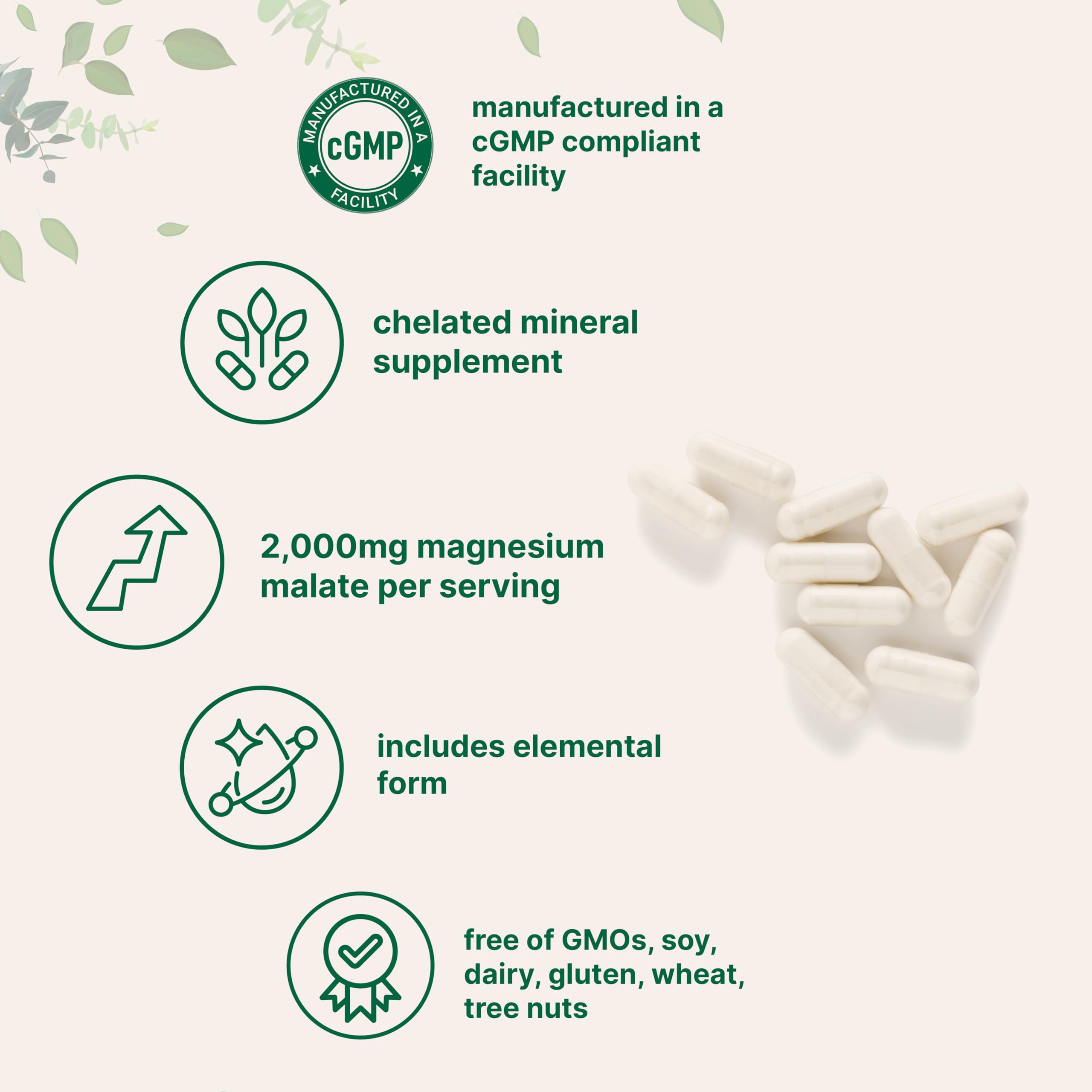 - Each bottle provides 240 capsules for a 60-serving supply, delivering 2,000mg of magnesium malate with 300mg of elemental magnesium per serving.