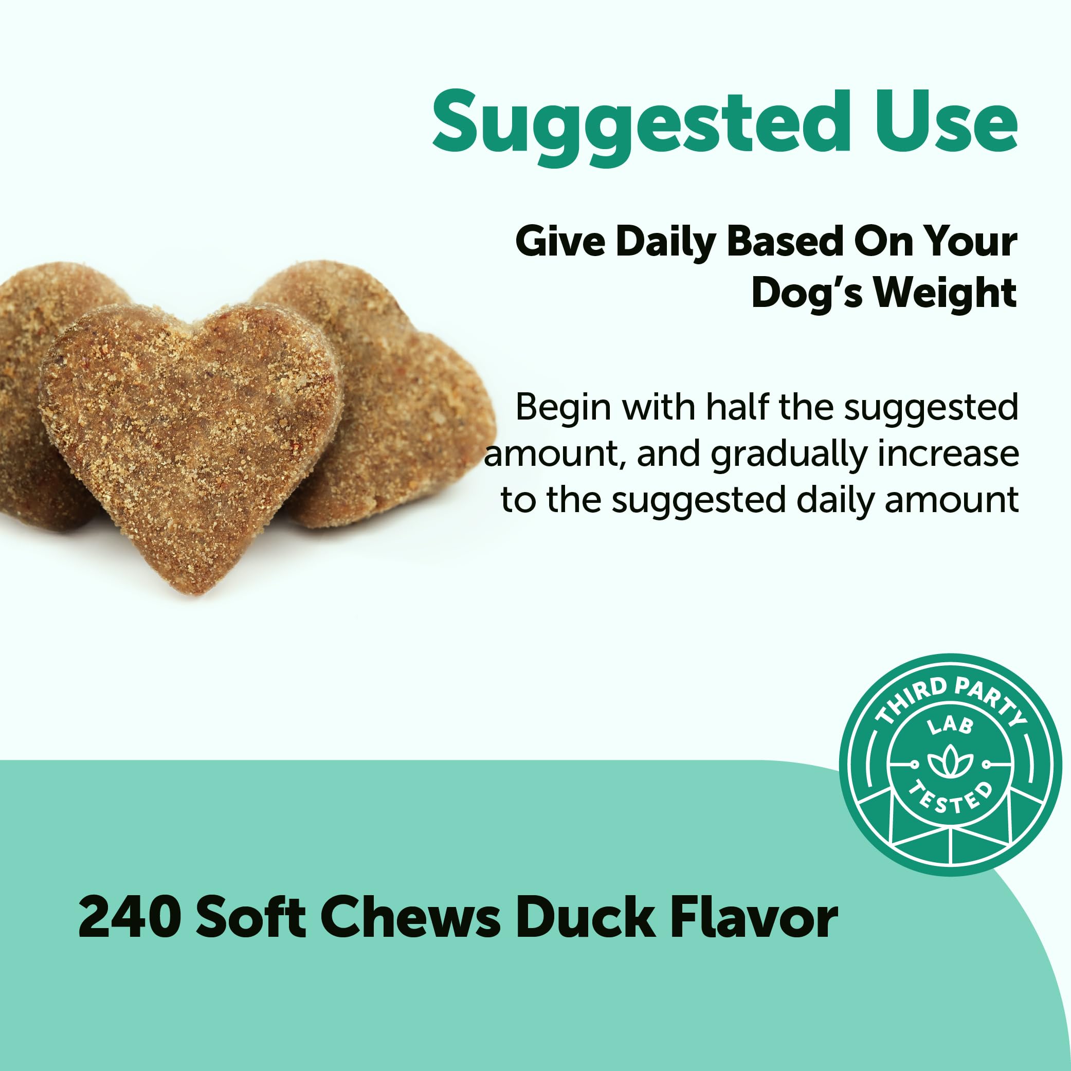 - Soft, chewable format designed for easy daily supplementation.* Each pouch contains 240 soft chews containing real duck, offering a long-lasting supply with serving sizes ranging daily based on dog size, suitable for all ages.