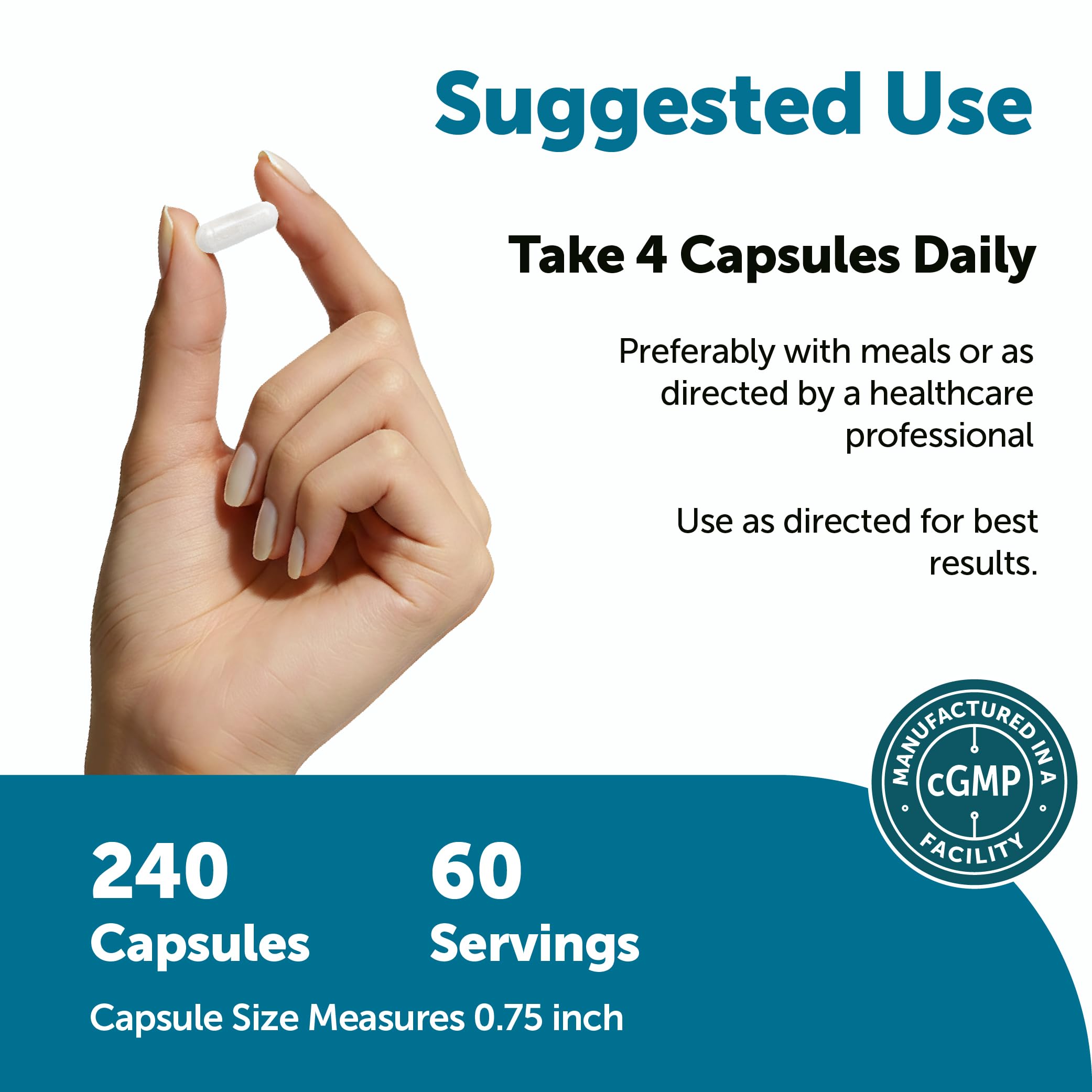 - Each bottle contains 240 capsules with a serving size of four capsules daily, providing a 60-serving supply. Capsule format offers a convenient option for adults looking to maintain a simple daily routine.