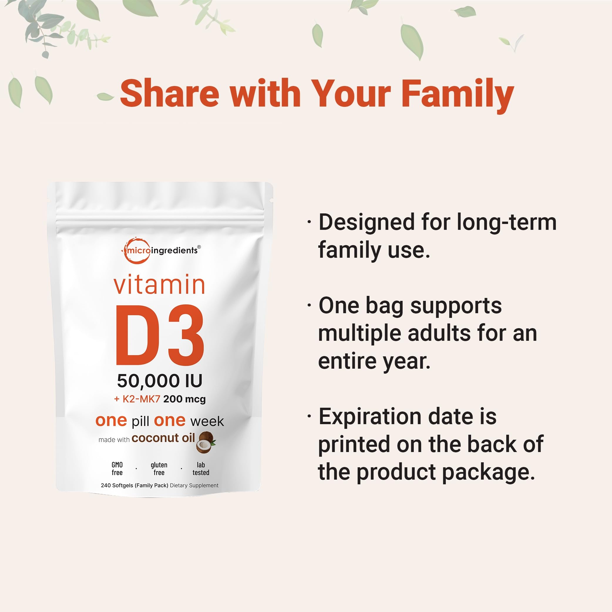 - Enjoy a family size of 240 easy-to-consume mini coconut oil infused softgels. A potent once per week complex that can be shared with multiple family members. 50,000 iu Vitamin D3 and 200 mcg vitamin K2 per dose.